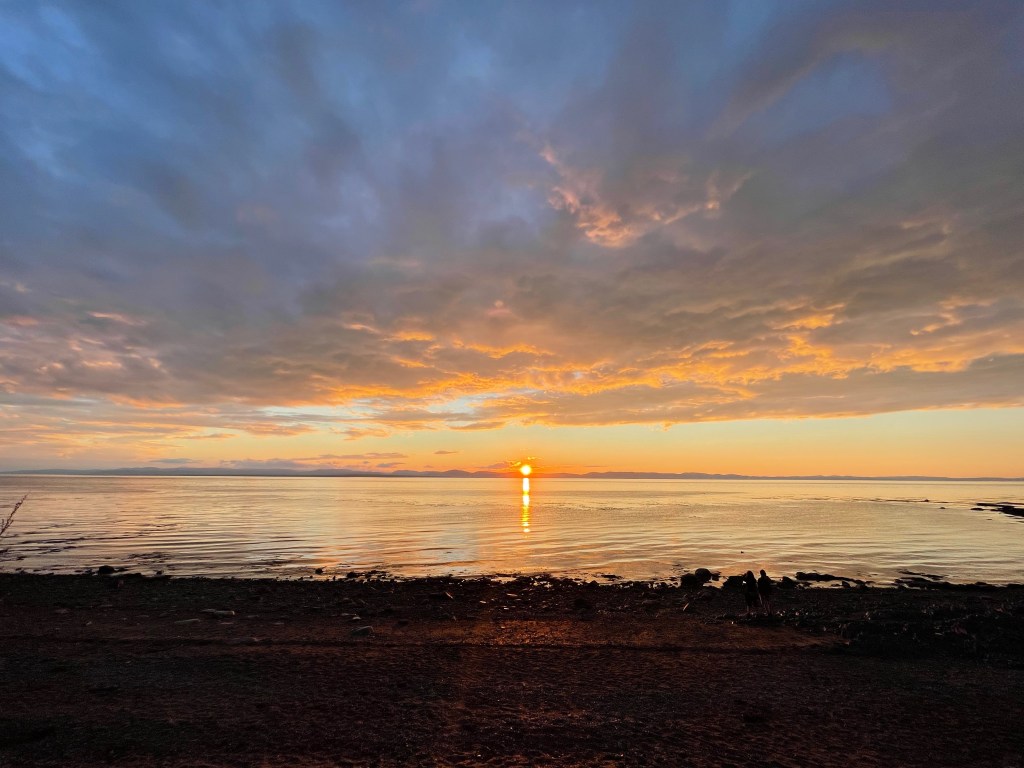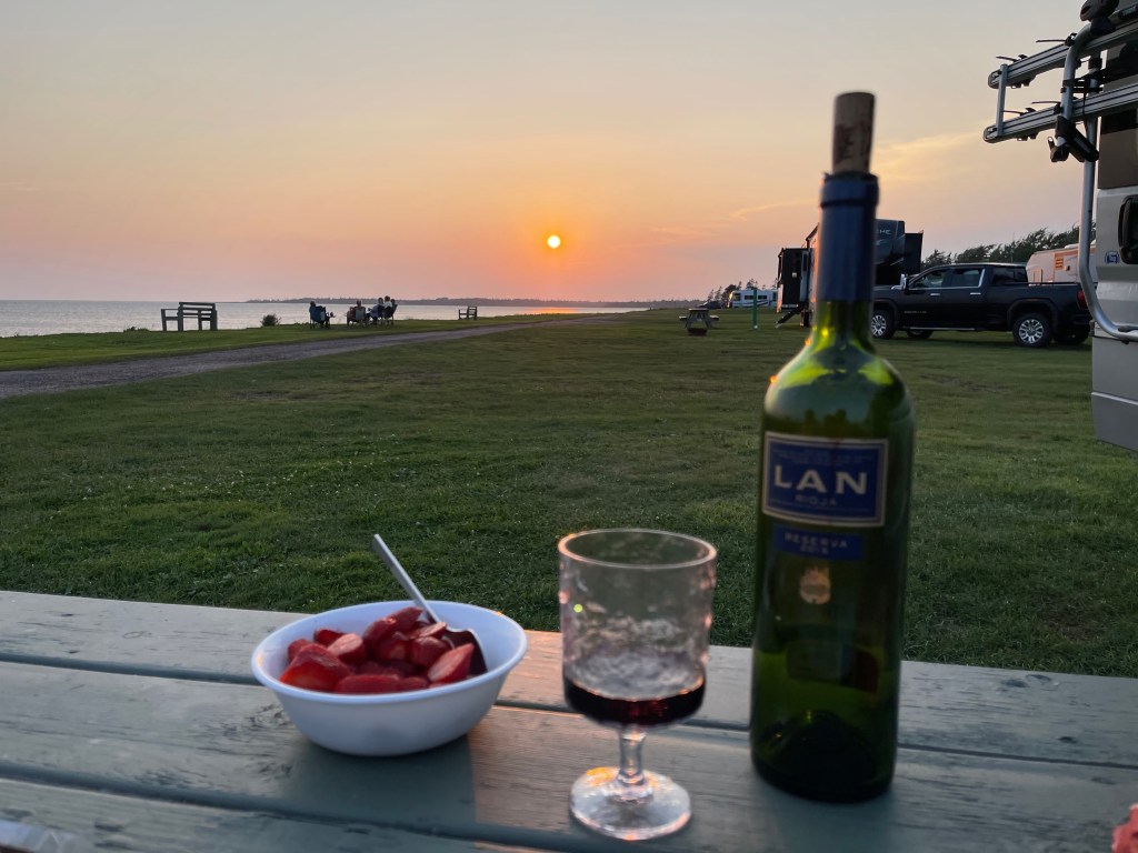 Réveil à 5Heures. Invasion de moustiques. Beau lever du soleil avec de la brume. Départ pour Cap-aux-Meules. Arrivée à 6h15. Albert fait son café. Attente pour l’embarquement. Mais nous sommes en avant. Pour la traversée, nous sommes dehors sur le pont supérieur. Soleil. Nuage. Vent agréable. Arrivée à 12h30. Route pour le camping provincial Linkletter, près de Summerside (PEI). Site sur le bord de l’eau. Baignade avec souliers. Douches. Lecture. Souper. Repos.