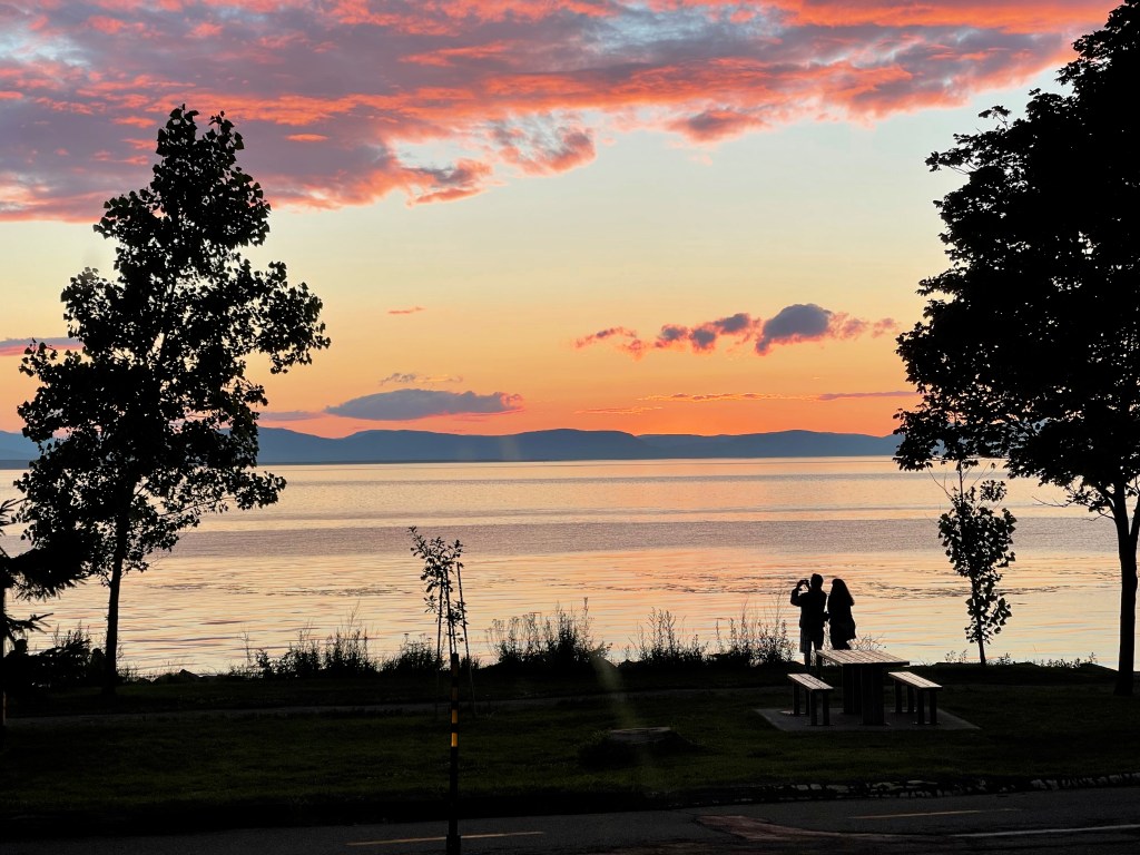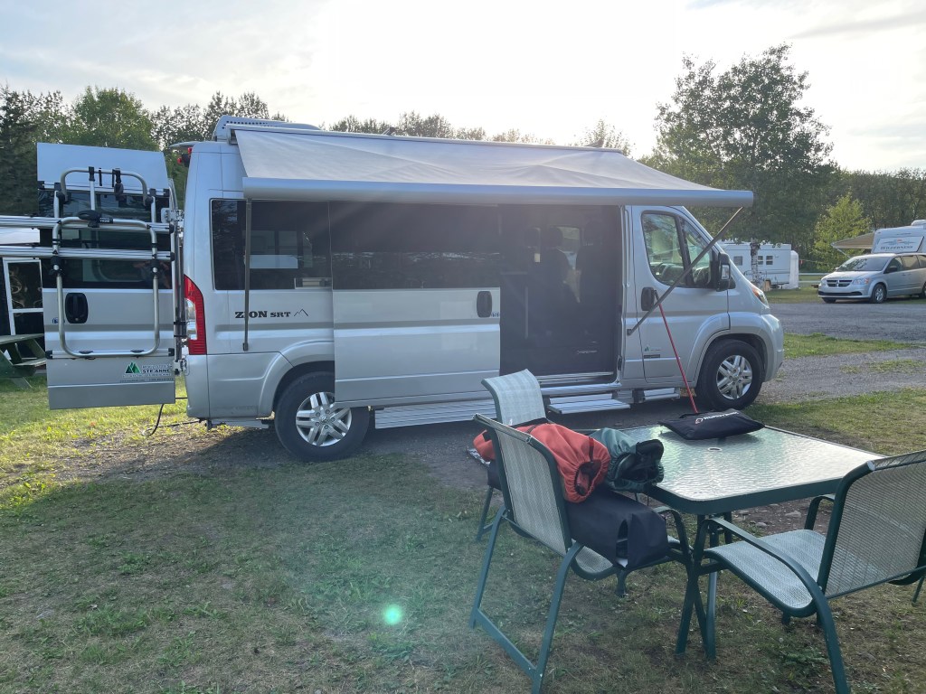 Journée de route, près de 600km. Soleil/nuage avec beaucoup de vent. Beaucoup de camions. Arrêt au McDo de Moncton. Poursuite de la route. Arrivée vers 18h à Dégelis au Québec, au camping municipal. Vue sur le lac. Salles de bain très propres. Rencontre d’un couple demeurant près de Joliette et ayant un Zion. Ils nous ont donné des trucs de rangement et nous avons vu comment ils avaient intégré un lit permanent. Nous avons écouté le bureau des légendes, puis coucher.
