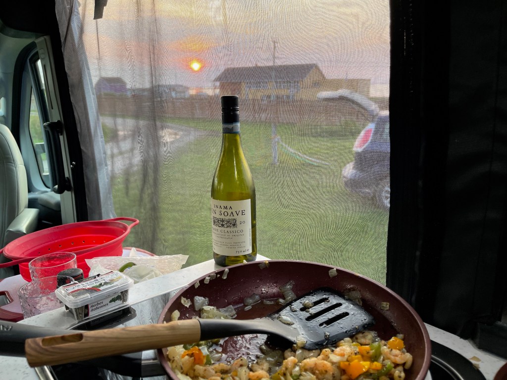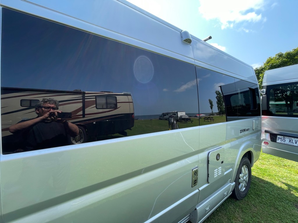 Très beau temps, baignade le matin, en début d’après-midi et fin de journée. Mer claire et fraîche. Visite d’un propriétaire Roadtrek Zion 2018. Satisfait. A des interrogations sur 2 points : le siège du conducteur et les protecteurs par rapport au soleil pour le pare-brise en avant. Albert a répondu aux questions. Le visiteur ressemblait à mon père. Il avait le même regard. Spécial. Je pense souvent à mon père et ma mère en VR. J’ai fait de nombreux voyages en « Travco » avec mes patents et mes sœurs et frères. Nous étions 7 enfants. Très beaux souvenirs.