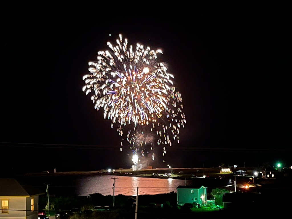 Changement de site – 54, sans service. Lavage du linge au camping puis dîner au casse-croute à côté du camping. Après-midi de repos au camping. Lecture. Aujourd’hui, nuageux avec des éclaircis. Soleil apparu à 18h. Souper à 18h30 à l’auberge à Denys à François, pour nous chez Francine. Toujours très bon. Puis Feux d’artifice en l’honneur de la fête des acadiens et retour du au camping.