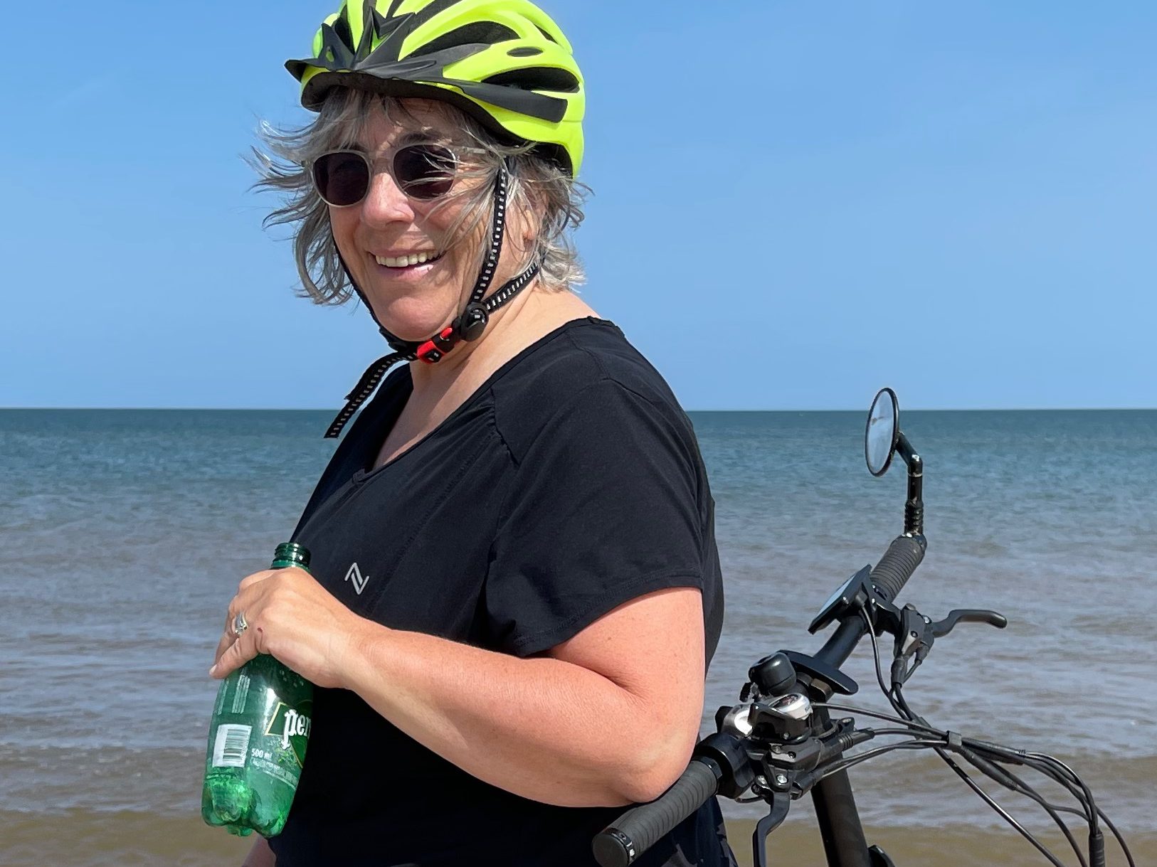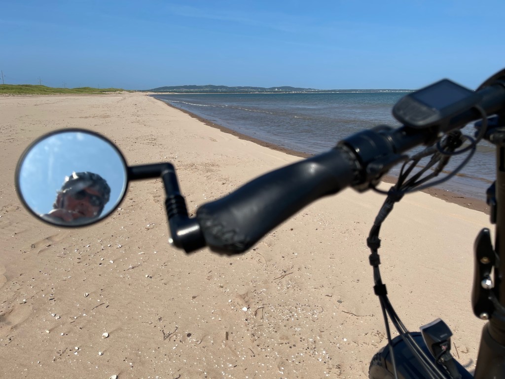 Changement de site, le 54. Belle journée. Baignade le matin. Nous avons parlé à Florence. Elle va bien. Jean-François aussi. Puis, nous sommes allés à l’Étang-du-Nord pour la location de nos vélos électriques «Fat Bike». Nous avons fait du vélo sur la route et sur la plage de la Martinique. Je suis allée dans le sable, j’ai bloqué et je suis tombé. Je ne me suis pas fait mal! Expérience intéressante. Au retour, nous sommes allés jusqu’au port, à la crèmerie. Puis, retour au camping, baignade et souper.