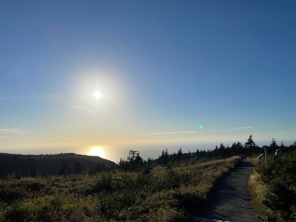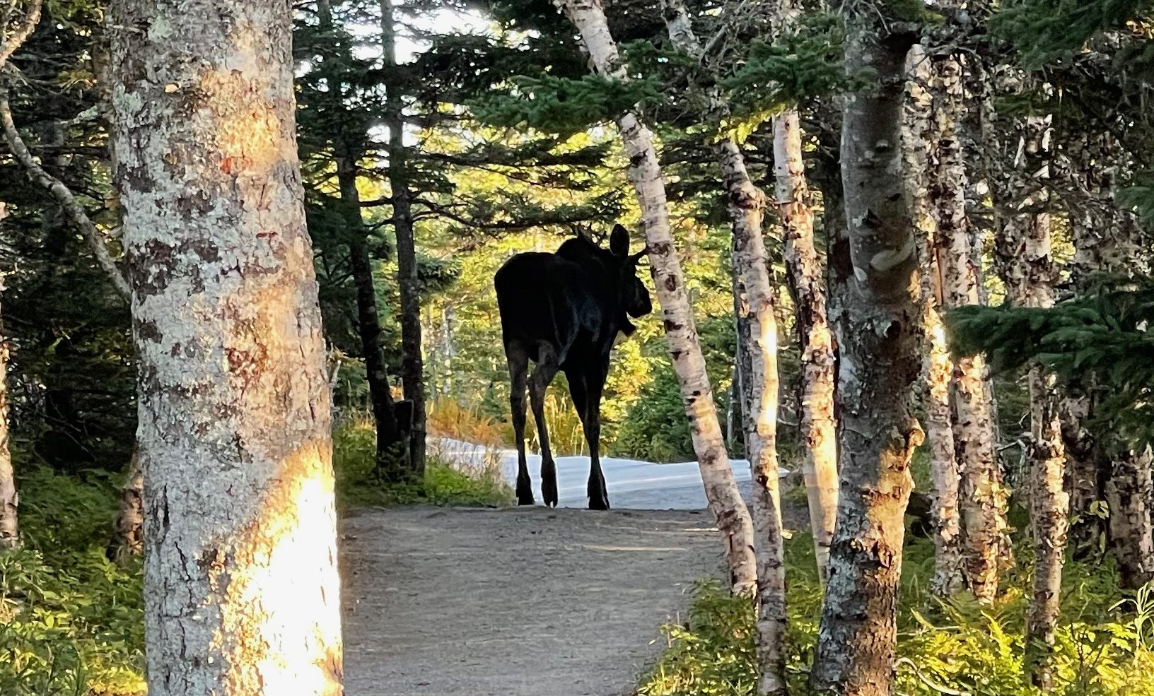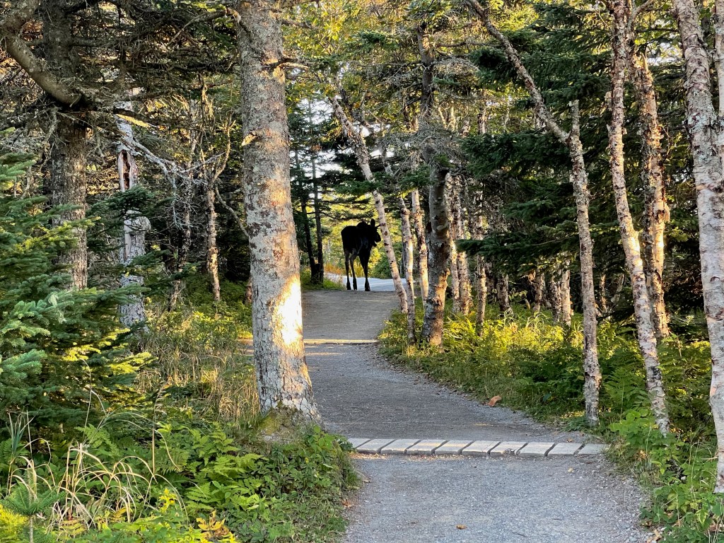 Beau temps. Déjeuner, puis achats à la boulangerie Aucouin : très bonne tarte aux pommes. Course à la COOP et retour au centre d’accueil pour internet pour Albert. Puis départ, pour marcher le « Skytrail » en fin de journée avec une guide de Parcs Canada. Très bonne montée de la route pour se rendre au sentier. Vue magnifique sur le golfe St-Laurent avec coucher de soleil. Durant la marche, nous avons vu un jeune orignal. Albert a pu le prendre en photo. Puis retour au camping. Une longue descente très raide pour le VR.