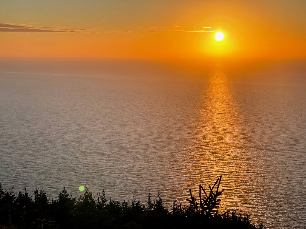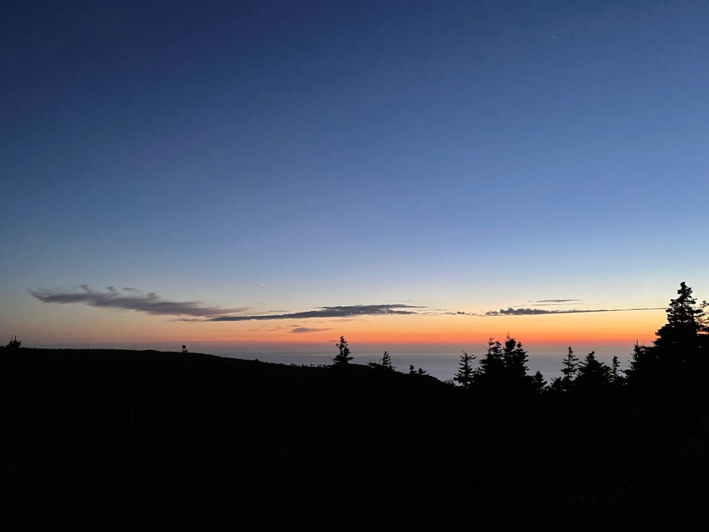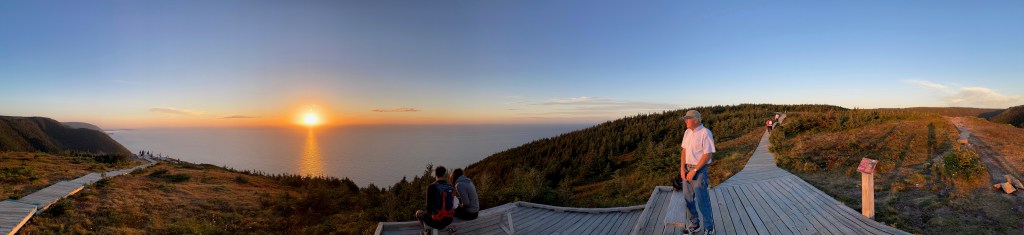 Nous avons dormi jusqu’à 10h.Déjeuner tranquillement. Échangé sur la jeunesse d’Albert (malade à 14 ans) et l’arbre généalogique des Lejeune. Puis, pavillon d’accueil et centre d’information du Parc. Nous modifions nos réservations et avons accès à internet. Albert a fait le suivi de ses courriels. Puis, nous avons appelé Marie-Louise, la sœur d’Albert, en Belgique, afin de prendre des nouvelles de Michel, leur frère. Puis, nous sommes allés au début du Cap Breton, à 3 points de vue sur la mer pour voir le coucher de soleil. Très beau. Temps magnifique aujourd’hui.