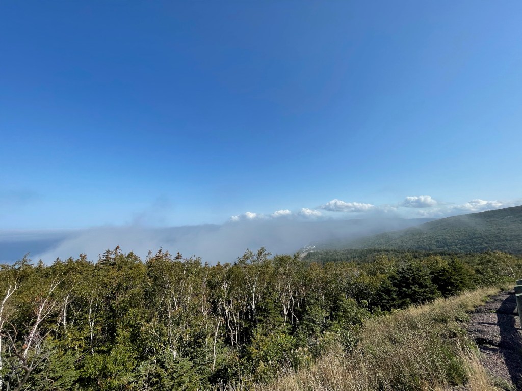 Route avec des fortes, très fortes côtes. Points de vue sur le golfe magnifiques. À mi-chemin, la brume est arrivée et la visibilité n’était pas bonne. À partir de ce moment-là, nuageux. Le soir, bruine. Albert a appelé un relais à l’UQAM pour sa demande de subvention. Il doit travailler au moins une journée de plus (dossier débuté dans le VR en juin dernier avec 2 co-chercheurs). On s’ajustera en fonction du temps.