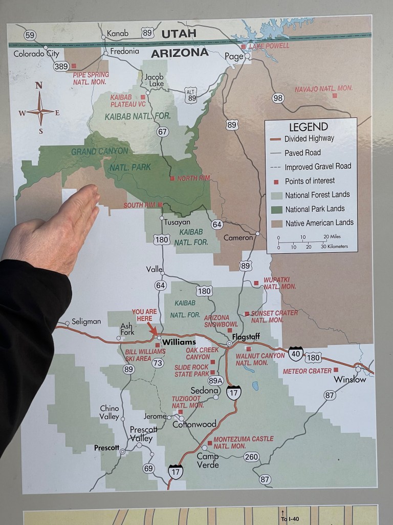 Le matin, nous avons déjeuné tranquillement au motel. Nous avons rencontré une famille française (Lille et Bourgogne). Un peu surpris de la nourriture … Par la suite, nous sommes arrêtés à Flagstaff pour faire un marché au « Whole Food ». Très beau magasin. Nous avons dîné là. Puis, nous sommes partis pour Williams au KOA. C’est notre premier soir en camping. Nous n’avons pas mis d’eau dans le VR, car il fera -3 Celsius la nuit. Il faisait -14 Celsius la nuit dernière…