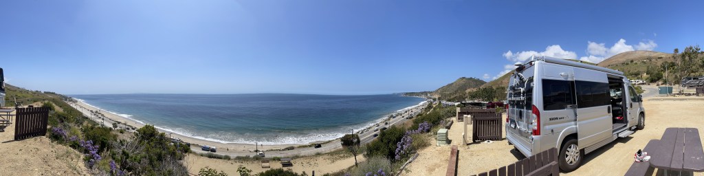 Visite le matin, de Las Vegas, en VR seulement. Nous avons fait le tour. Puis, départ pour la Californie. Très venteux sur la route mais ensoleillé. Des rafales à 60km heure. C’était dangereux. Nous avons passé par Los Angeles et couché dans un camping près du Pacifique. Nous entendons l’océan et la vue est magnifique. C’est plus frais qu’à Las Vegas. Très belle vue.