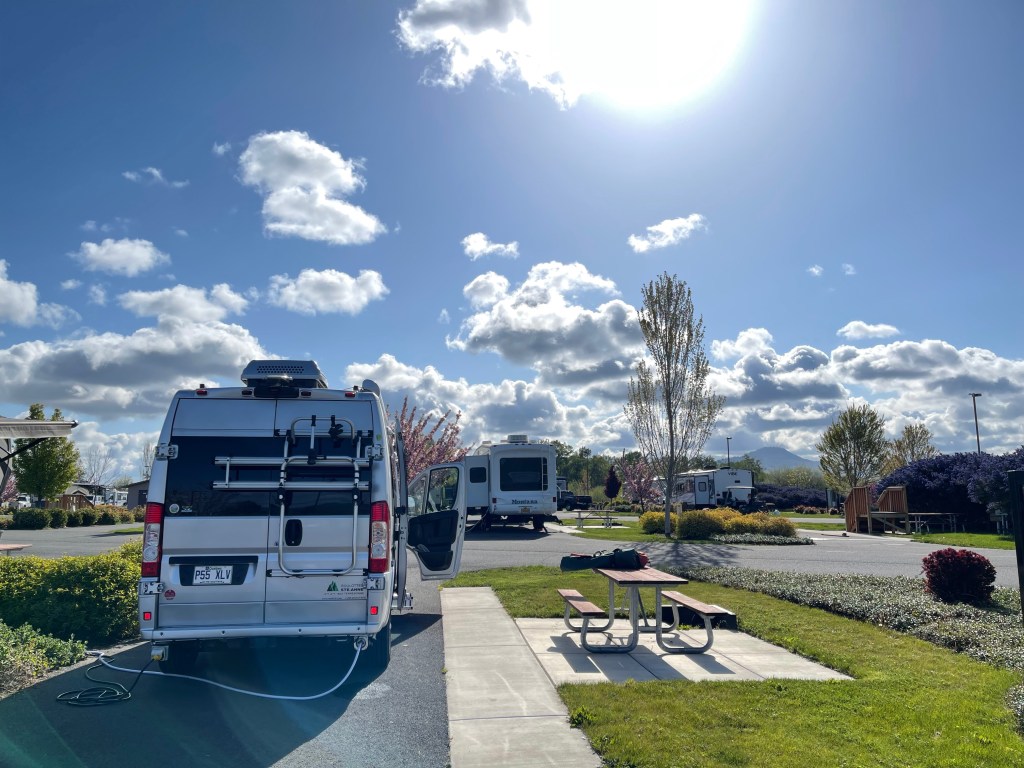 Au fur et à mesure que nous approchons de l’Oregon, le paysage change. Au début, zone agricole fruitière, peu à peu des montagnes. Autoroute 5 est très bien dessinée, elle serpente le territoire. Puis, nous arrivons en Oregon. Impression d’un paysage suisse. Très beau. Arrêt à un camping à Medford. Très bien tenu. Paysage avec des cerisiers en fleurs.